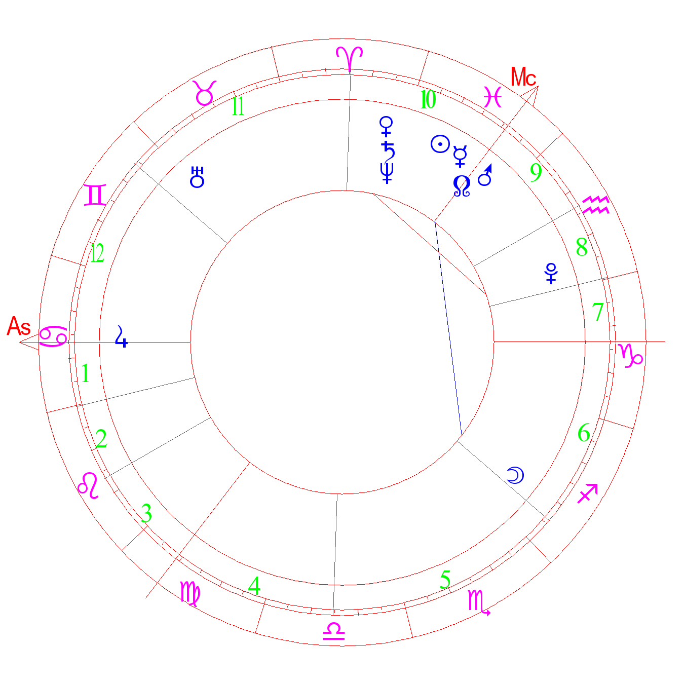 The degree of healing, occultism, great enthusiasm. Loneliness, harmony, musicality. A person with a great imagination, higher spirituality, detachment, not of this world. [-] suicide or bladed weapon wounds (ASA). Fight without success, frustration, lack of courage. The degree of Mercury (Kefer)