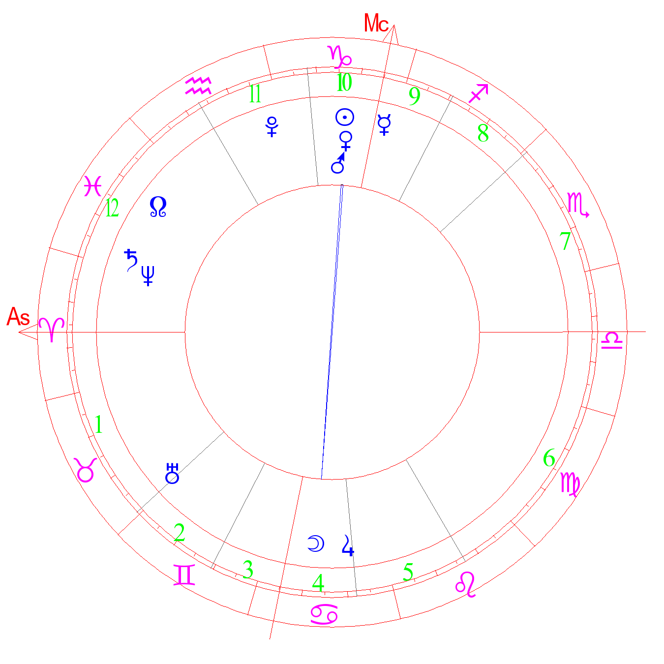 The fall of Jupiter. Degree of fertility. The degree of immigration. Passion, enterprise, drive, initiative, mobility of nature, love of sports, hunting, physical strength. A very good degree, luck is held in hands. But there is no support from the social authorities, a person is forced to make his own way, gain authority at the expense of Jovian qualities. [-] risk of disaster (ASA). The one, conscious of his own strength, bold undertakings, ethos of sport, overcomes great difficulties. The degree of Jupiter (Kefer). Degree of duty (deVore)