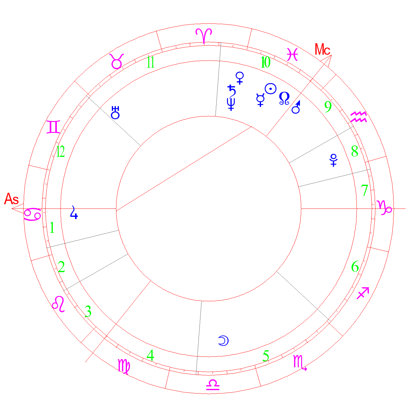 The fall of Mercury. Great ambition, ability to make things happen through own perseverance and hard work. A large good family, many children. (ASA). Love for family, danger to life, vigilance, accuracy, success. The degree of Mars (Kefer)