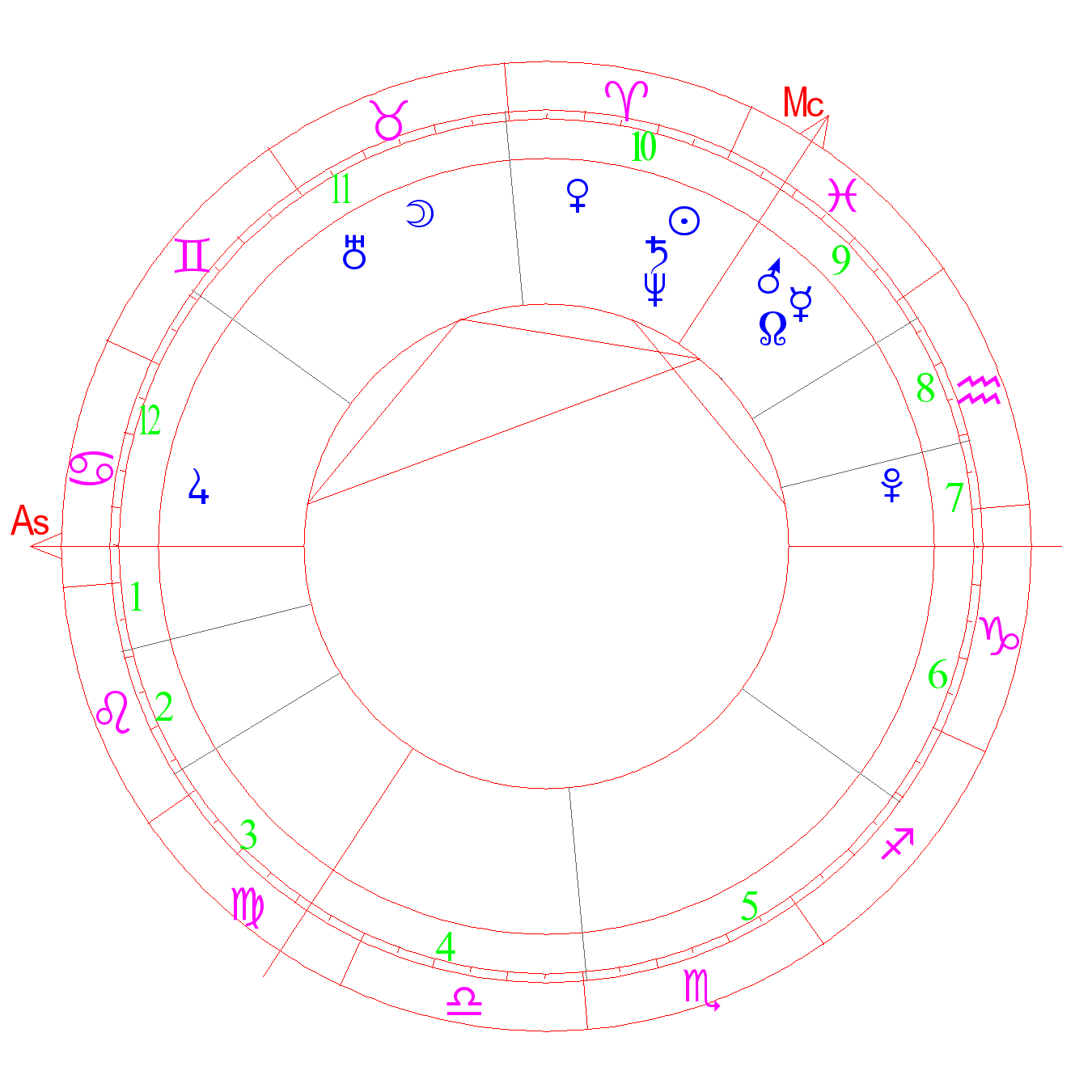 Nagy önteltség, kitartás, agresszivitás, önbizalom. [-] számos ellenség, katasztrófaveszély (ASHA). Érvek, szorongás, vállalkozás, a rend szeretete, az irigység (Kefer). Sebészet foka; szervezési készségek (Devore)