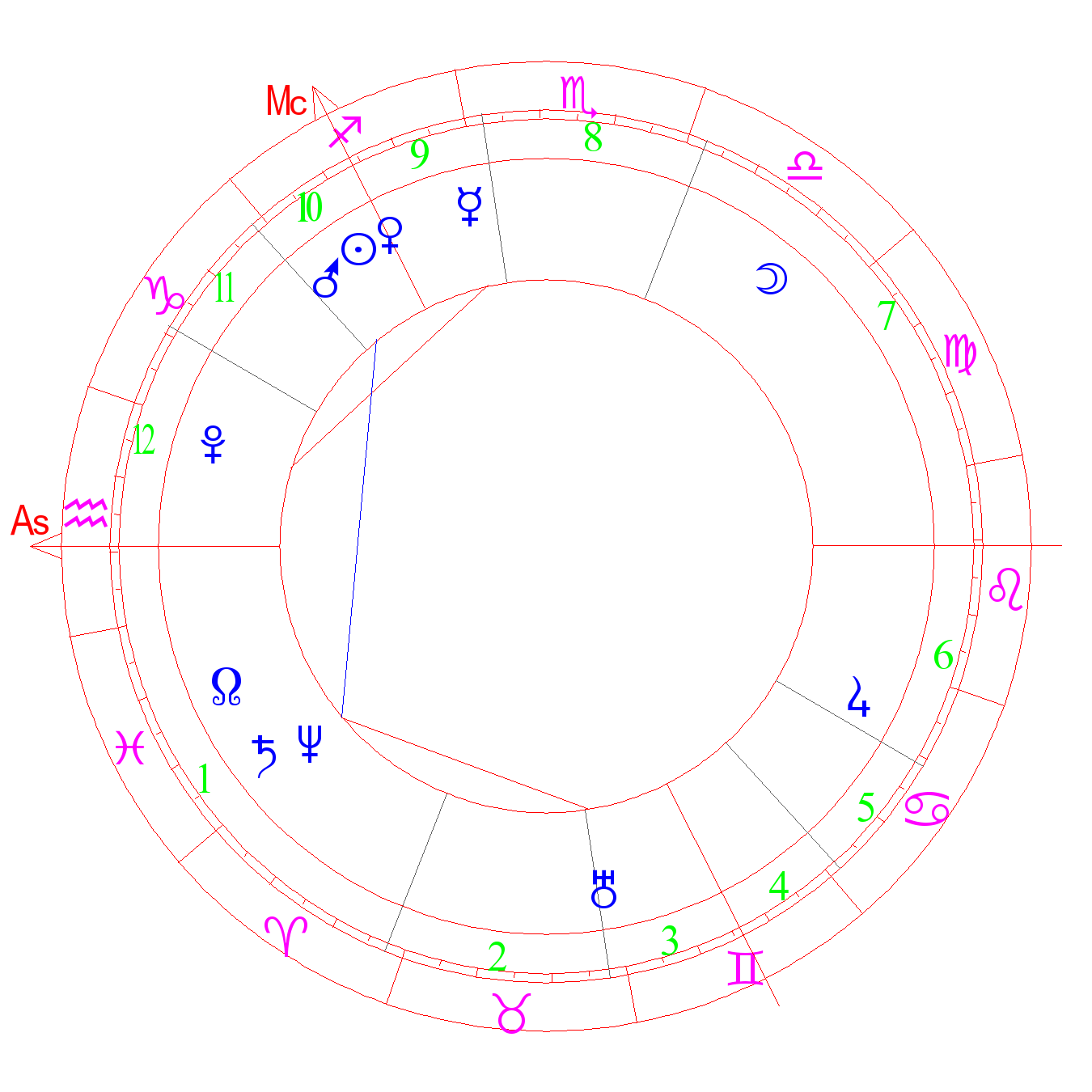 Трудная борьба в жизни, дух противоречия. Агрессия. Опасность ран от огнестрельного или холодного оружия. Военная карьера. Иногда дает склонность к извращениям, убийству (АША). Бои, агрессивность, огненный характер, опасность ранения, математические способности, при повреждении воспаление слепой кишки, безумие. Градус Юпитера (Кефер). Вера. Рост (Девор)